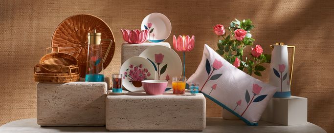 Warda: Inspired by the gardens of Taif and the fragrance of its blooming roses, its pieces unfold in harmonious pink tones, transforming your space into a blossoming scene filled with beauty and joy.